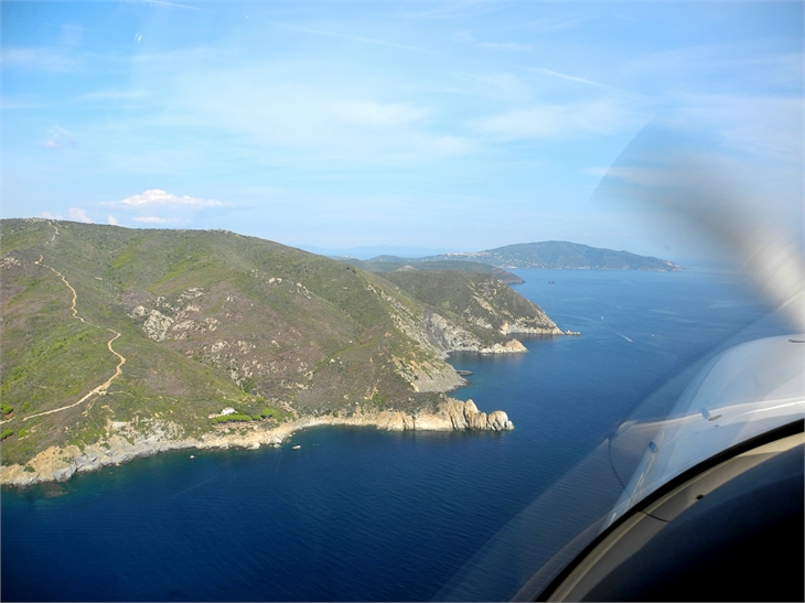 Nach eineinhalb schönen Tagen am Strand bzw. dem Kennenlernen der recht charmanten Stadt Alghero ging es weiter in Richtung Elba, mit einem Tankstopp in Figari (Korsika), welches genau auf Kurs lag. Hier der Überflug der nordsardininischen Küste bei Platamona. Auch dieser Ort hat einen kleinen Airstrip; man erkennt ihn links der Spitze des Sees.